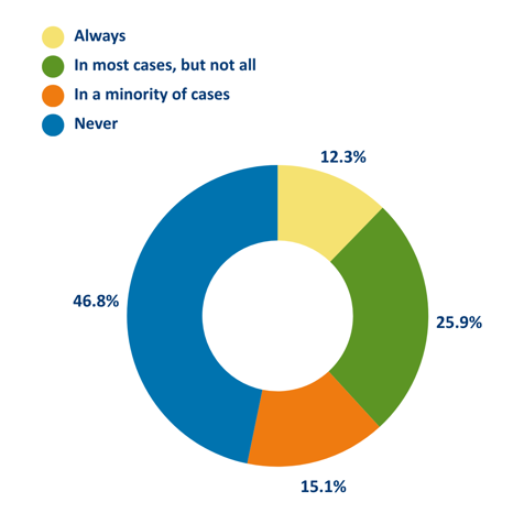- Insurers lead the way, with 58% saying they use ESG compliance always or in most cases.