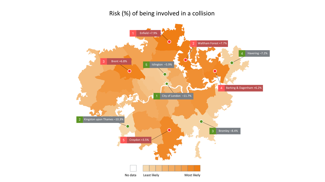 The knock-on effect is that insurance premiums are likely to be higher for those drivers living in the most risky areas (Enfield, Waltham Forest, Brent, Barking and Dagenham, Croydon), putting extra pressure on drivers’ finances at a time when motor insurance costs have increased dramatically.